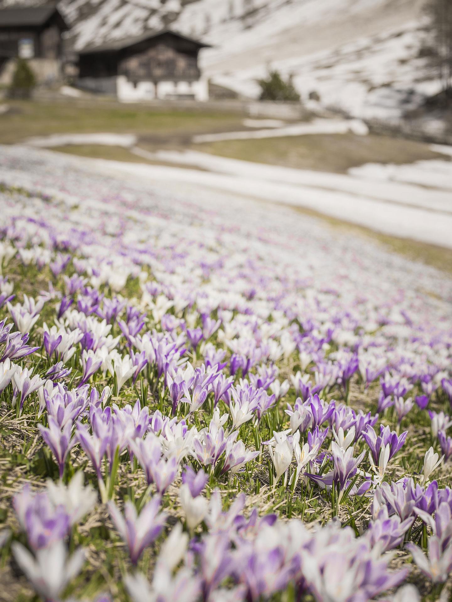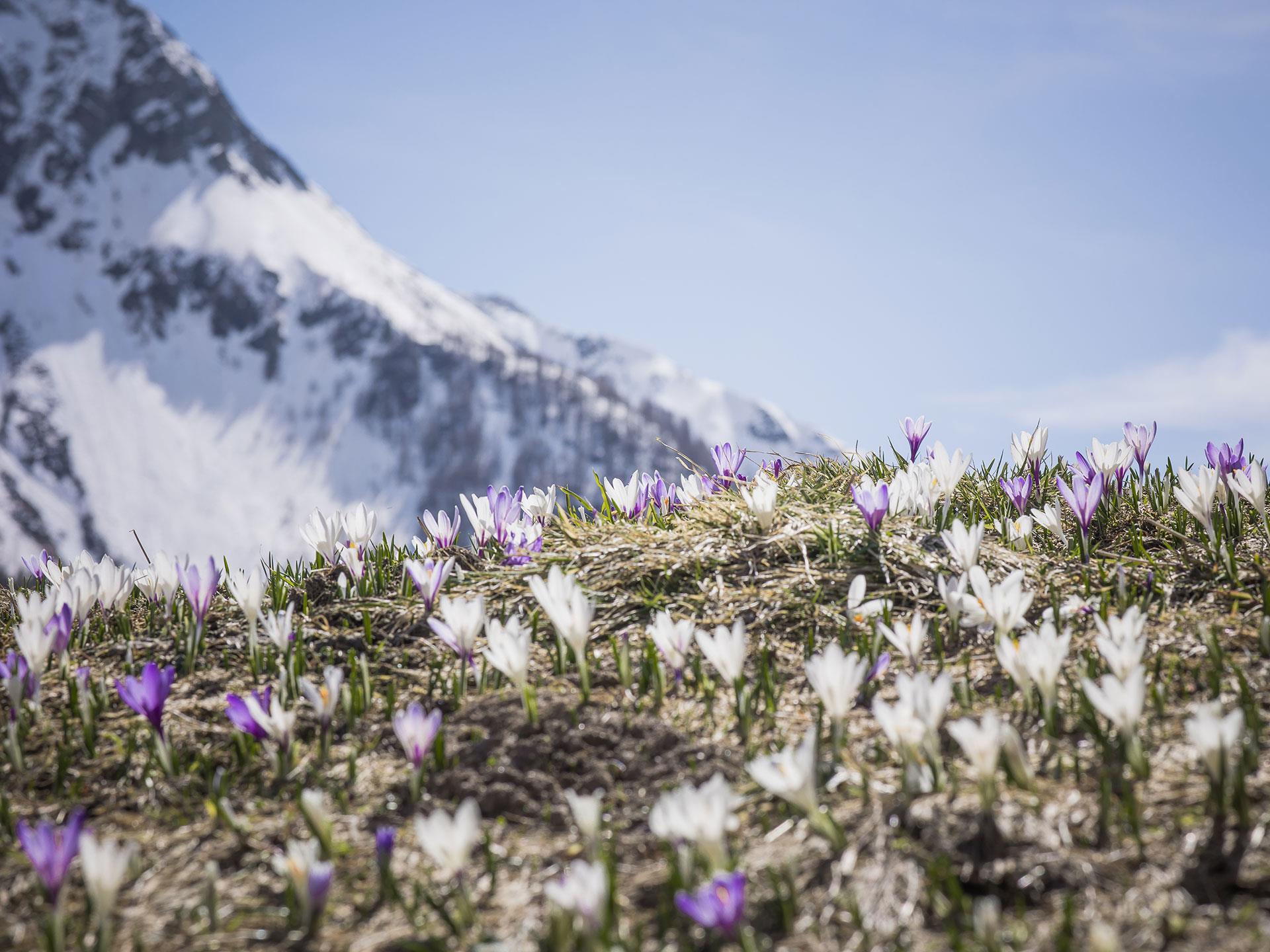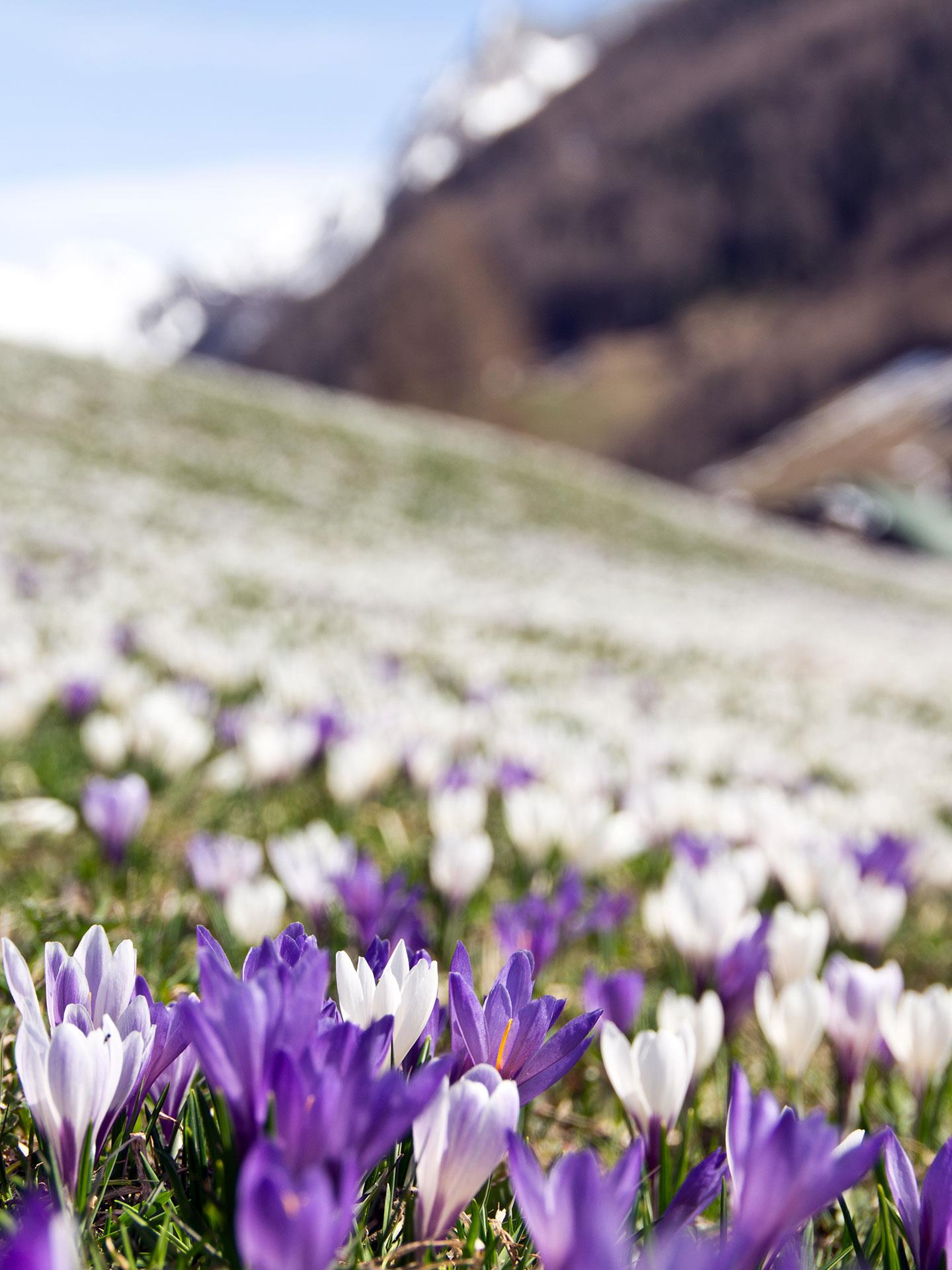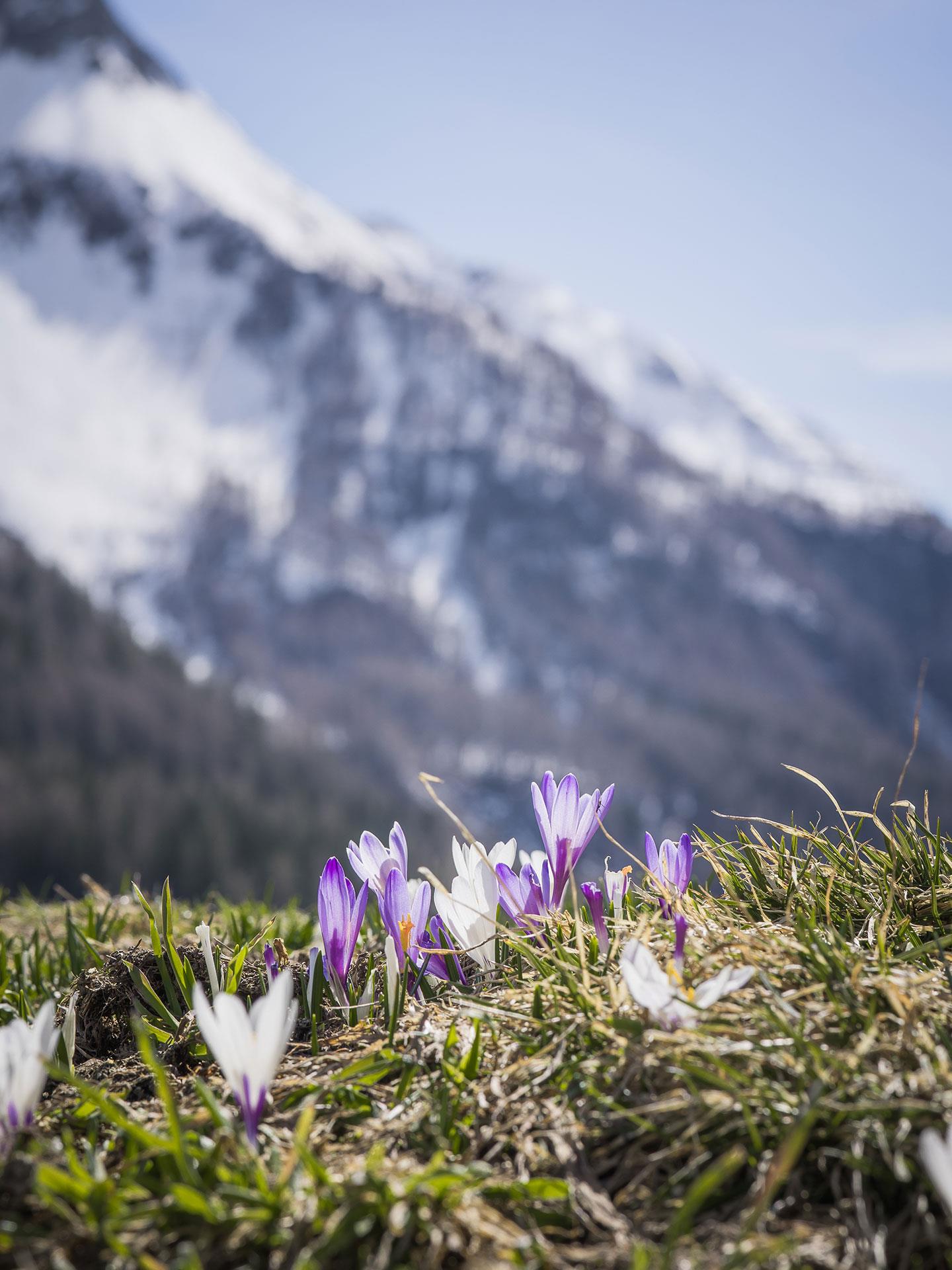 Ganz langsam schieben sich die ersten grünen Spitzen durch die noch kalte Erde der Schmelzwasserwiesen. Sobald die Sonne kräftiger wird, öffnen sich die Krokusse und verwandeln die eben noch winterliche Landschaft in ein weites Blütenmeer. Kaum eine andere Blume steht so sinnbildlich für den Aufbruch am Berg wie der wilde Krokus.