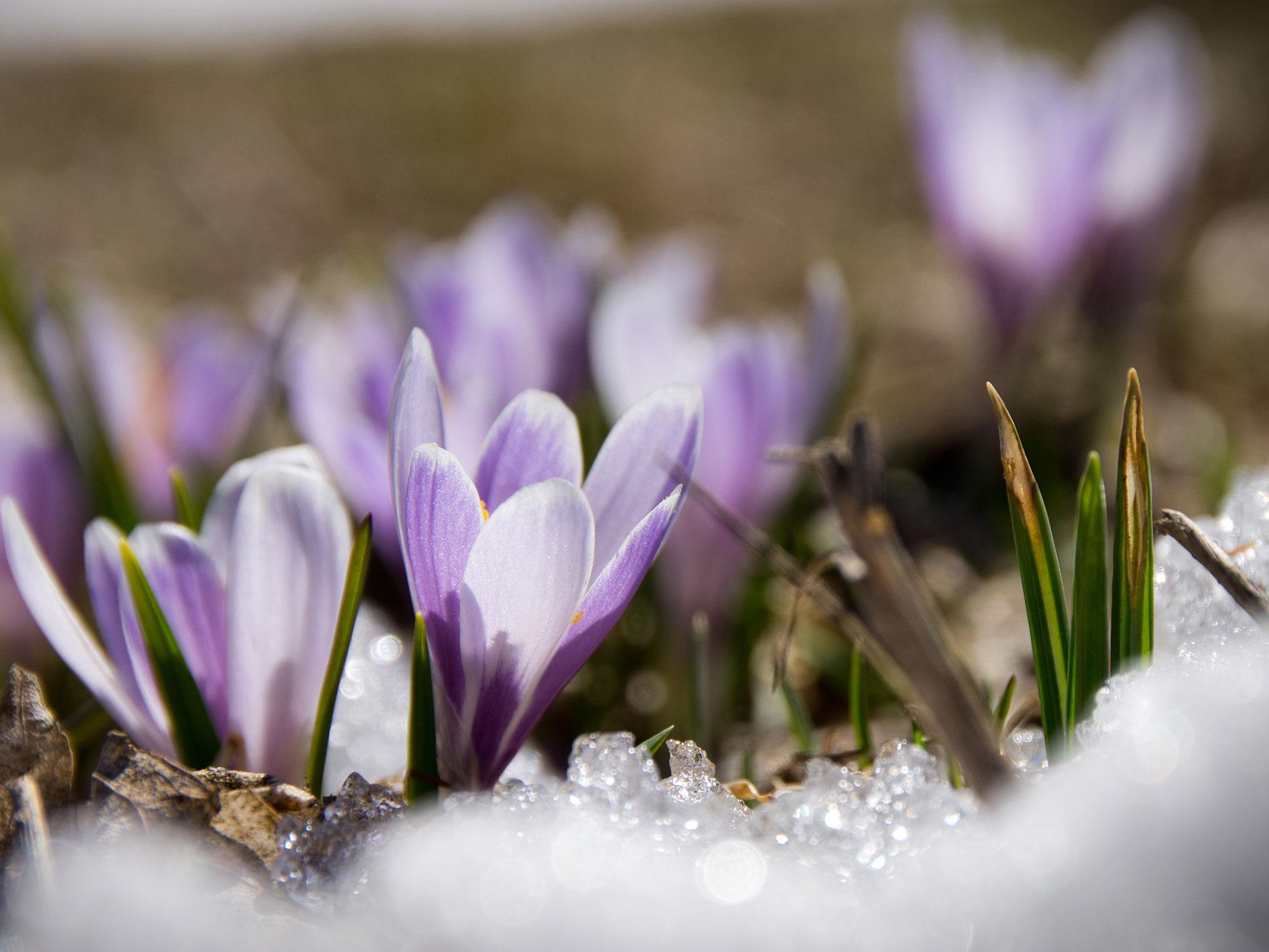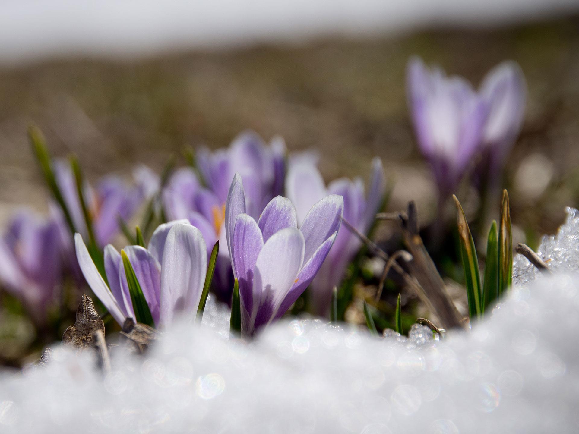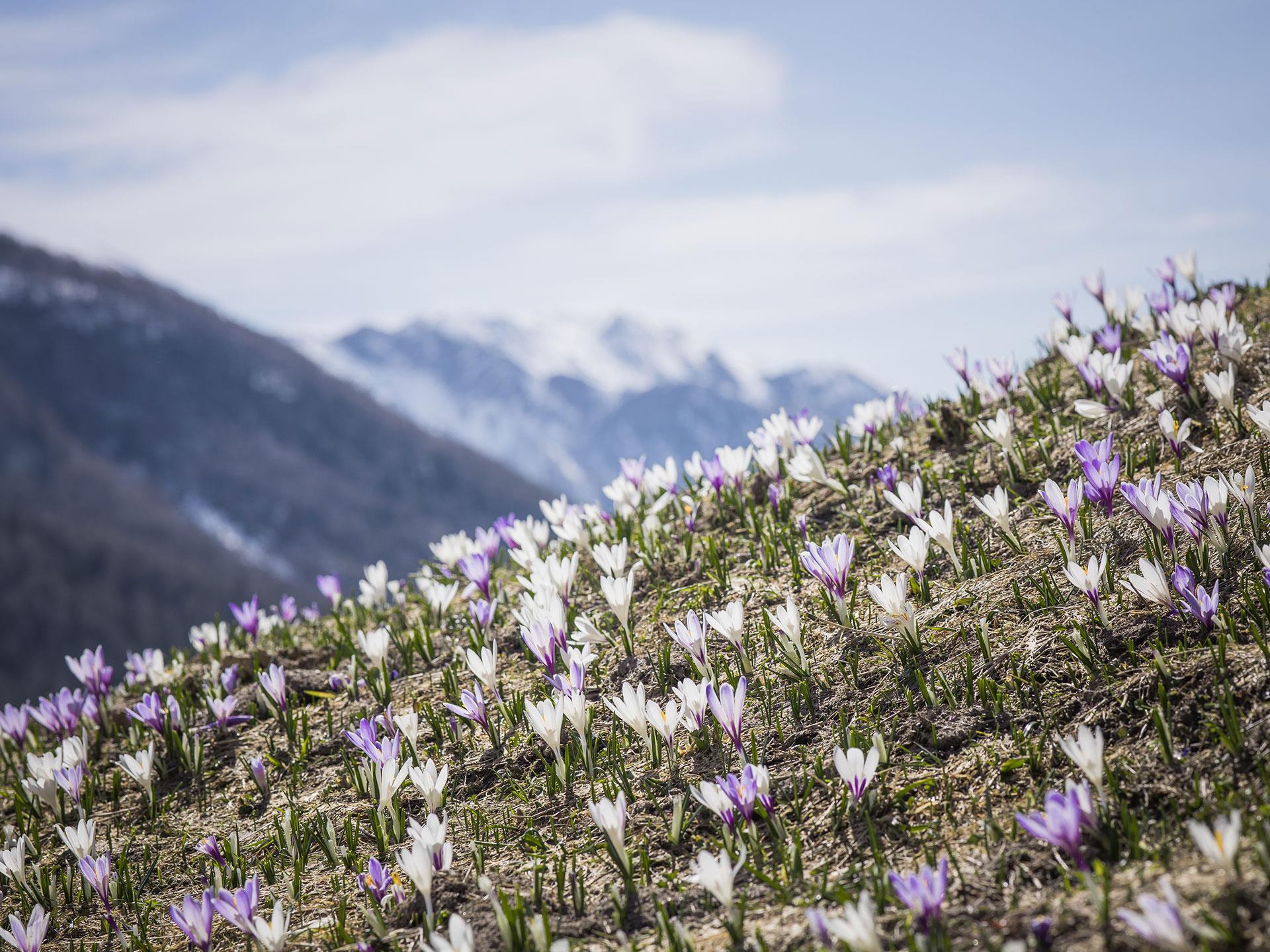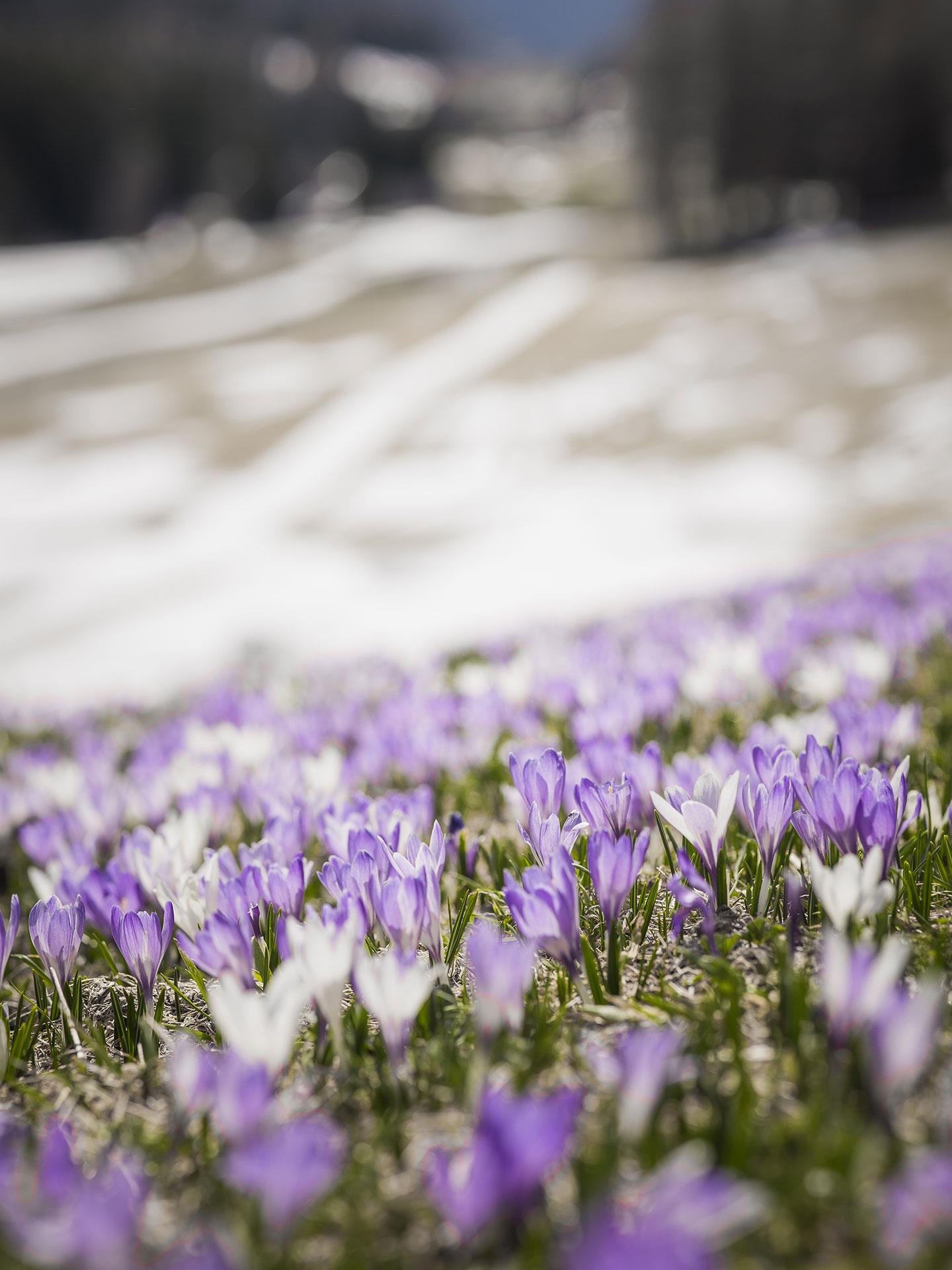 Ganz langsam schieben sich die ersten grünen Spitzen durch die noch kalte Erde der Schmelzwasserwiesen. Sobald die Sonne kräftiger wird, öffnen sich die Krokusse und verwandeln die eben noch winterliche Landschaft in ein weites Blütenmeer. Kaum eine andere Blume steht so sinnbildlich für den Aufbruch am Berg wie der wilde Krokus.